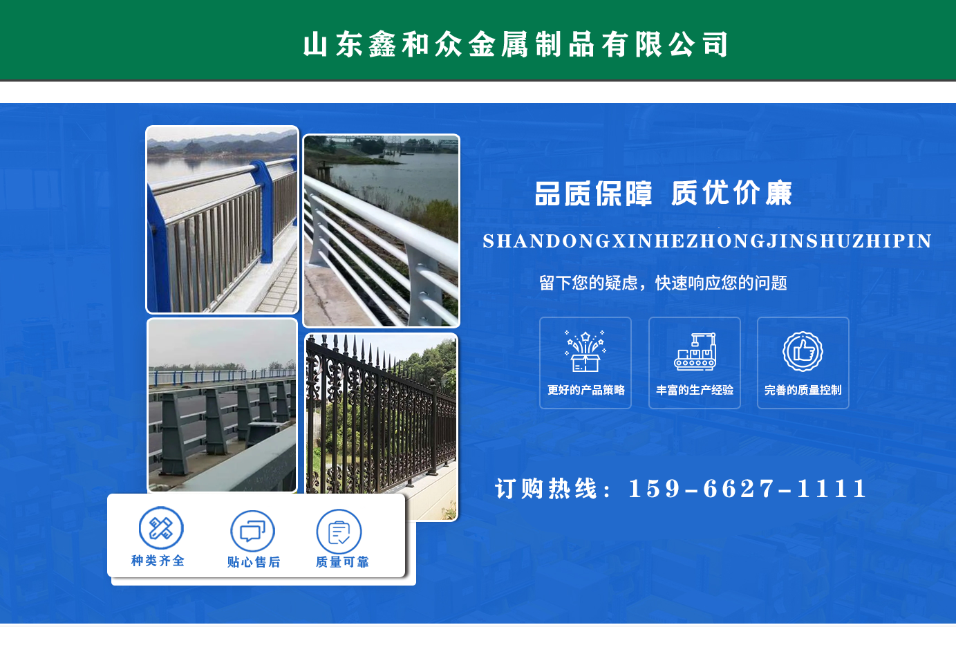 山東鑫和眾金屬制品有限公司主要產(chǎn)品有防撞護欄,橋梁護欄,道路護欄,河道護欄,不銹鋼護欄等護欄。提供設(shè)計方案,一站式定制,包您滿意價格優(yōu)惠,歡迎來電咨詢! 公司常年從事銷售護欄防撞護欄,橋梁護欄,道路護欄,河道護欄,不銹鋼護欄,橋梁鋼護欄,河道燈光護欄等。產(chǎn)品廣泛應(yīng)用于橋梁、河道、旅游景區(qū)、道路、公路、公園、小區(qū)、景觀、道路防撞等領(lǐng)域。 公司產(chǎn)品均采用優(yōu)質(zhì)不銹鋼材料,符合相關(guān)標(biāo)準(zhǔn)。各種型號不銹鋼復(fù)合管及護欄,質(zhì)量嚴(yán)格把控。產(chǎn)品強度高、耐腐蝕、焊接牢固、抗沖擊、性能好,防撞護欄結(jié)構(gòu)簡單、美觀實用大方?! g迎前來訂購!...